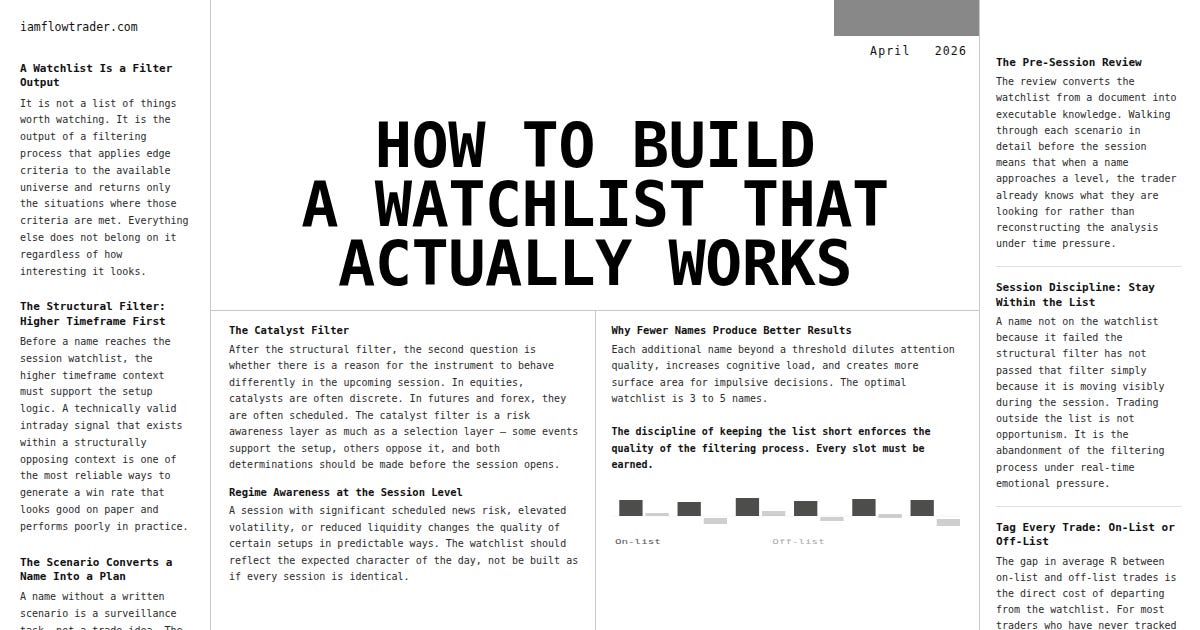 This newsletter is about how to build the second kind of watchlist. The filtering logic, the scenario construction, the regime awareness, the sizing of the list, and the discipline required to stay within it during the session are all components of a process that most traders have never formalized and most profitable traders have never abandoned.